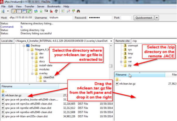 Using an SFTP client such as FileZilla, transfer the n4clean.tar.gz file that you extracted from the clean dist file to the JACE's /zip directory.