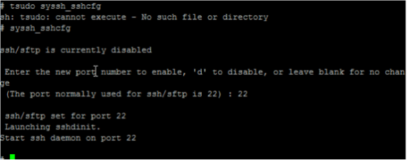 The Secure FTP service is not enabled by default on a JACE. If you did not enable it from the menu in the step above, you will have to start it now. First, try issuing the command tsudo syssh_sshcfg at the shell prompt. If the command fails, issue the syssh_sshcfg command. If it fails again, take these steps...
