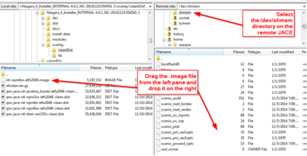 Next, transfer the .image file you extracted from the clean dist file to the JACE's /dev/shmem directory.